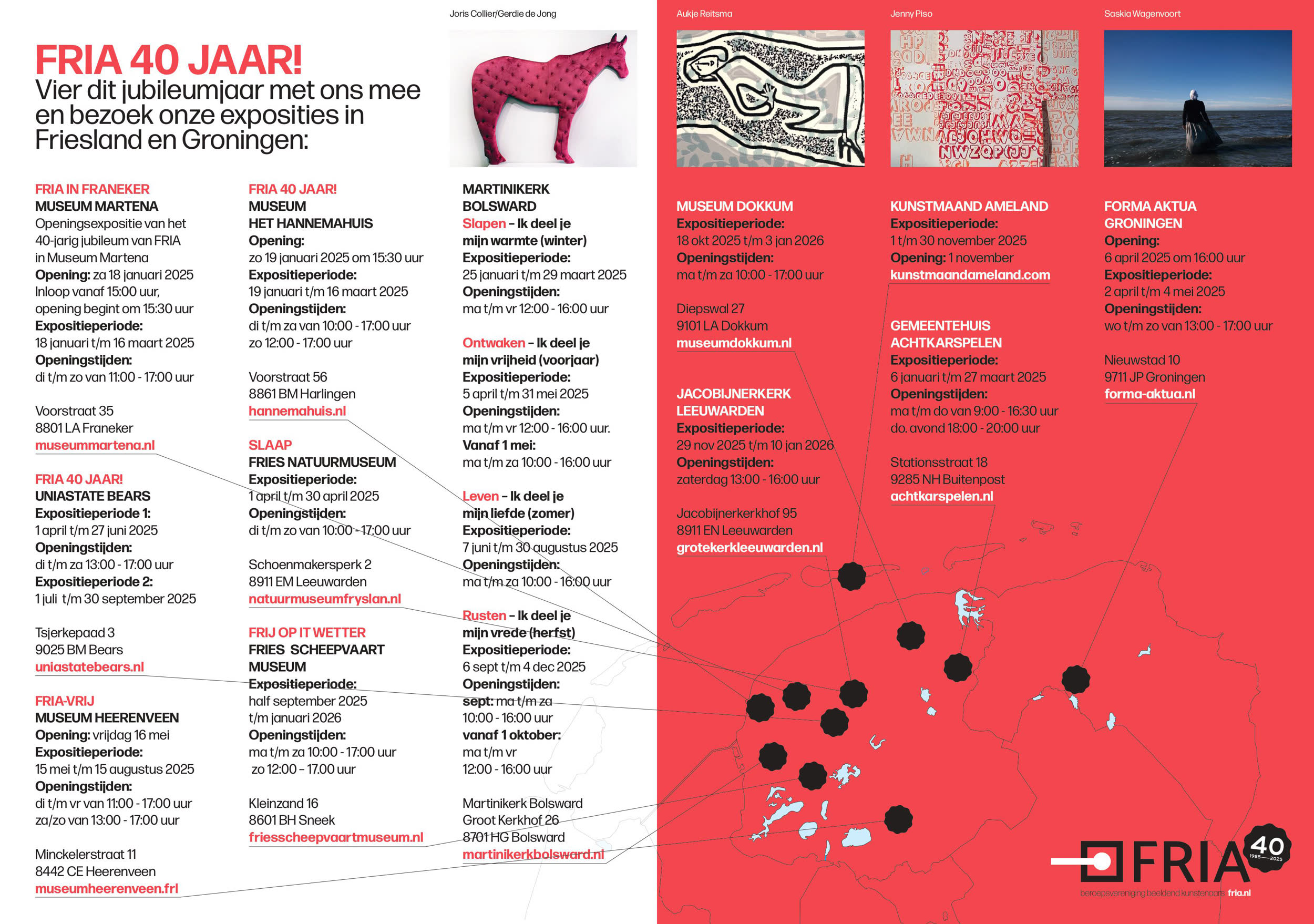 Ter ere van dit jubileumjaar organiseert FRIA in 2025 een serie bijzondere exposities waarin het werk van haar leden centraal staat. Deze tentoonstellingen vormen een ode aan 40 jaar creativiteit in Noord-Nederland. FRIA nodigt u uit om dit feestelijke jaar